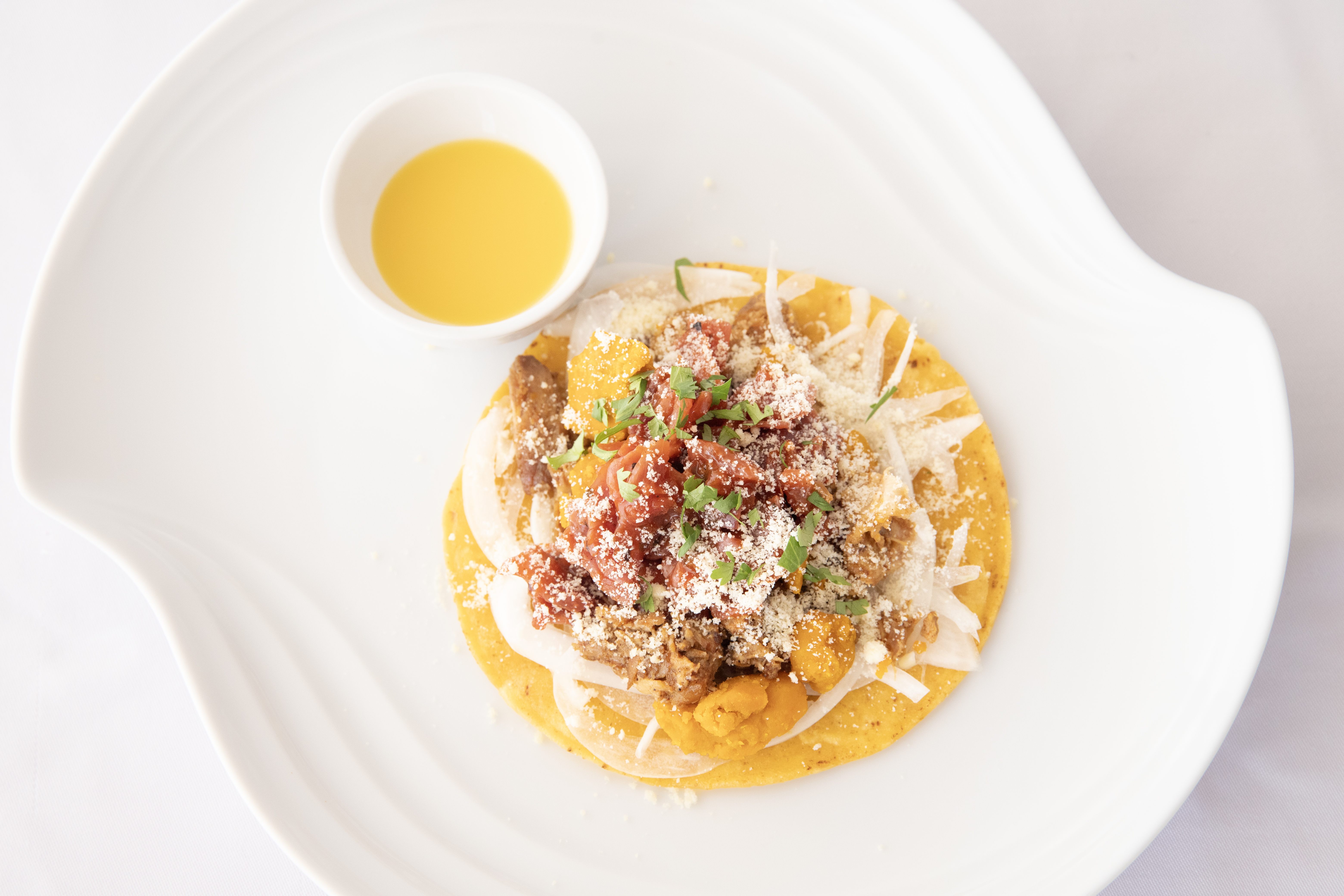 香ばしいコーンフラワー(とうもろこし)のトルティーヤで、箱根山麓豚のカルニタスを包みました。バラ肉の脂の甘みを、オリジナルスパイス・オレンジとライムのフレッシュな酸味が引き立て、煮込み料理とは思えないほど軽やかな味わいに仕上げています。