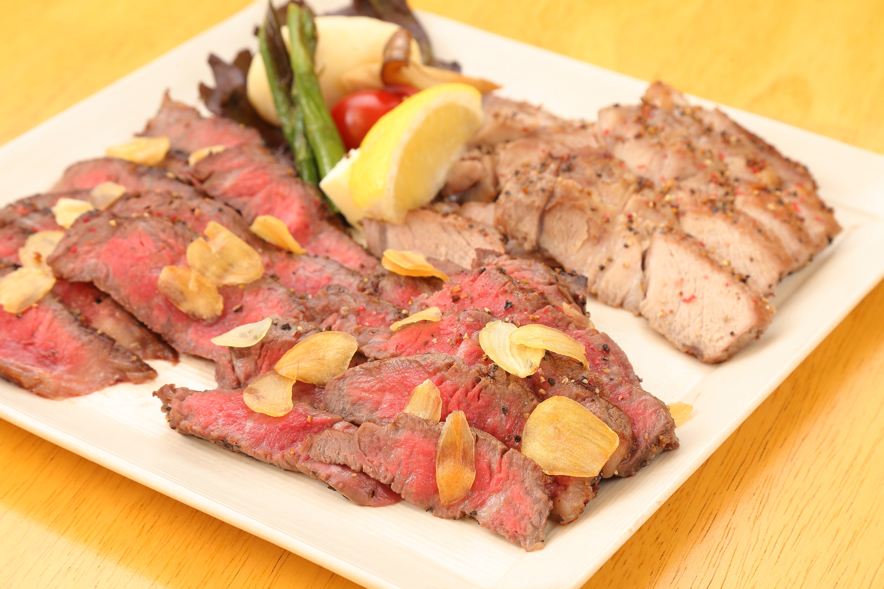 あしたか牛 サーロイン、ひれ、ふじのくにいきいきポークを、溶岩グリラーで焼き上げます。