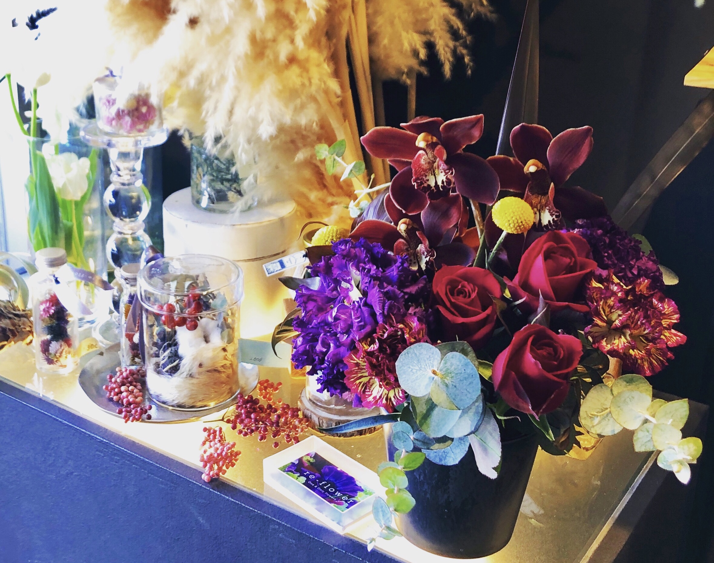鷹匠北街道沿の、こだわりのフラワーショップ。店内はシックで大人の雰囲気です。